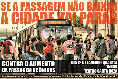 Ato contra o aumento da passagem de ônibus em João Pessoa. Hoje (12/01) às 15h na praça do Teatro Santa Roza.